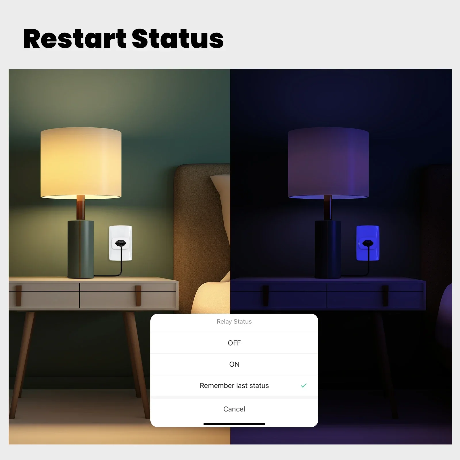 De acordo com a condição real, o status de reinicialização após ligar pode ser escolhido para evitar alterações inesperadas que possam incomodar sua vida.