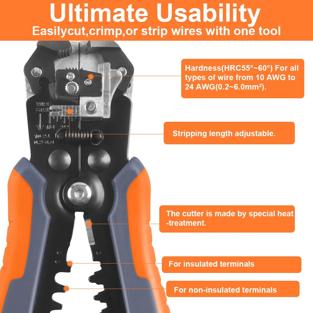 ✅【Ferramenta de crimpagem ajustável】Com um mecanismo de ajuste automático, um dispositivo de bloqueio ajustável e a função de liberar pontos de pressão. Ferramenta crimper é projetado para cravar 22-13AWG barril aberto não isolado, terminais de estilo OEM e emendas de fio.