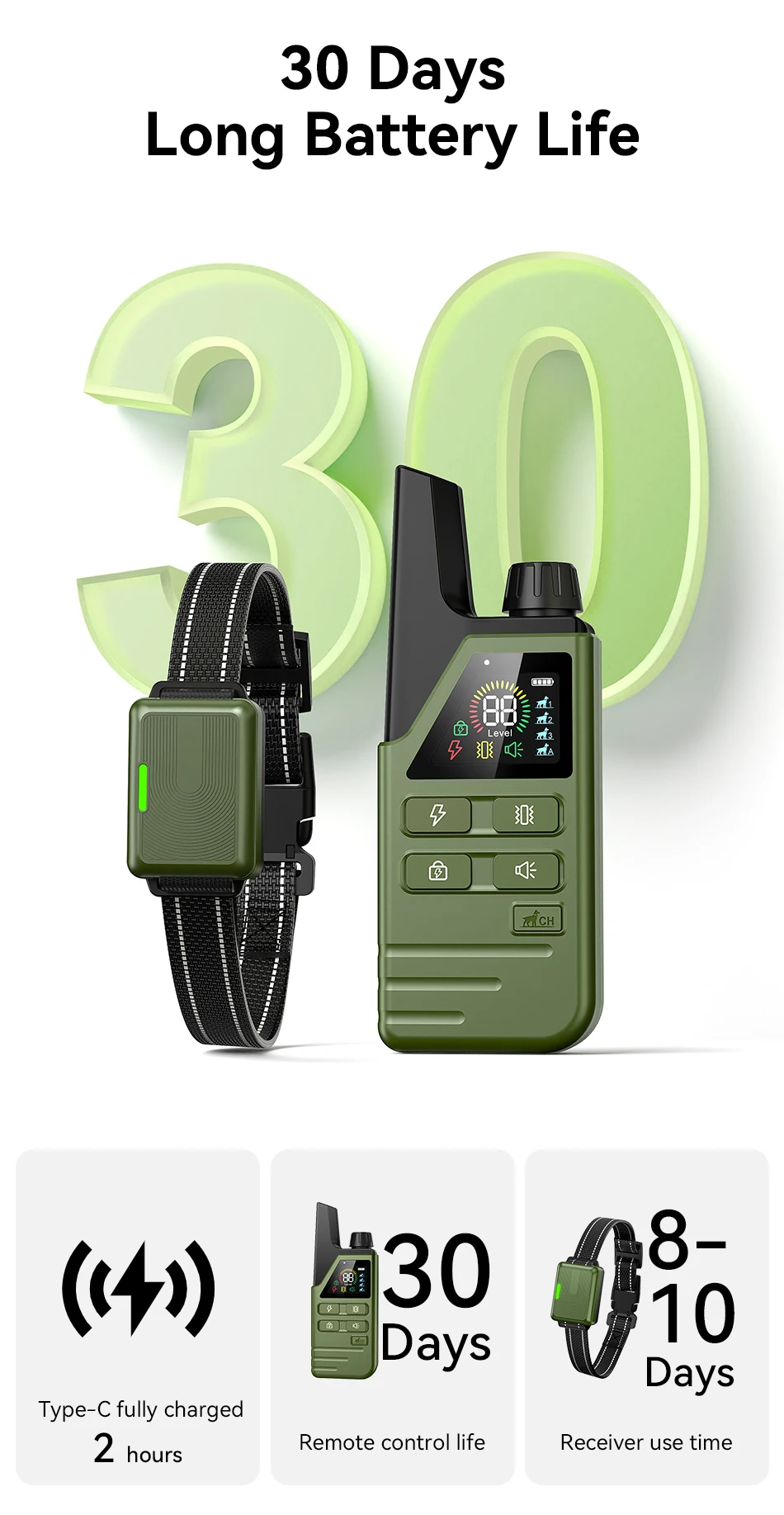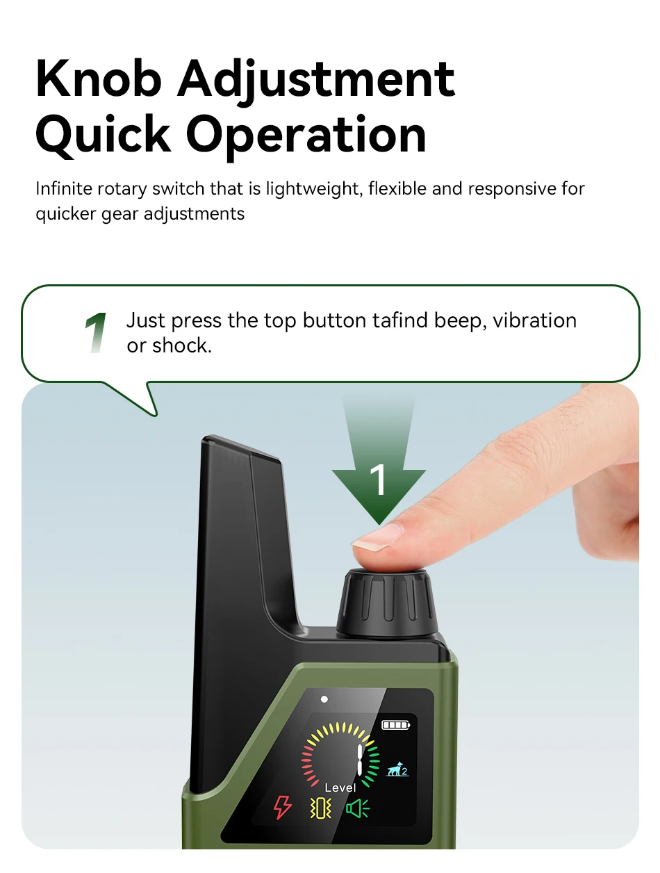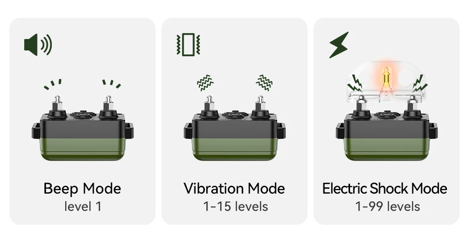 Product Feature 1: 3 Training Mode. Comprehensive training model that sends scientific commands to safely and efficiently correct your dog's bad habits