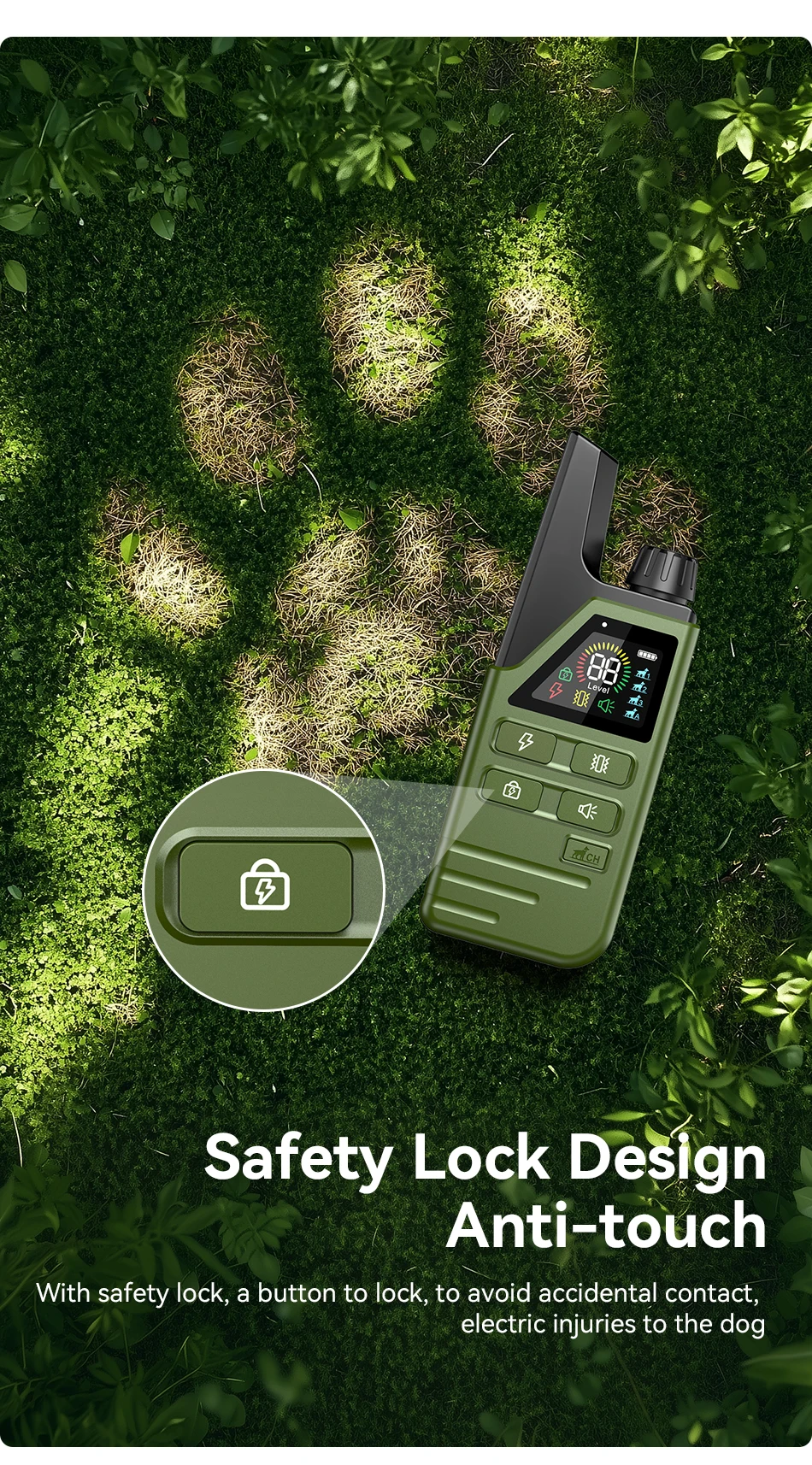 Product Feature 2: With safety lock, a button to lock, to avoid accidental contact, electric injuries to the dog