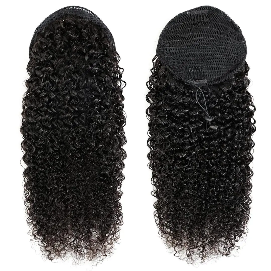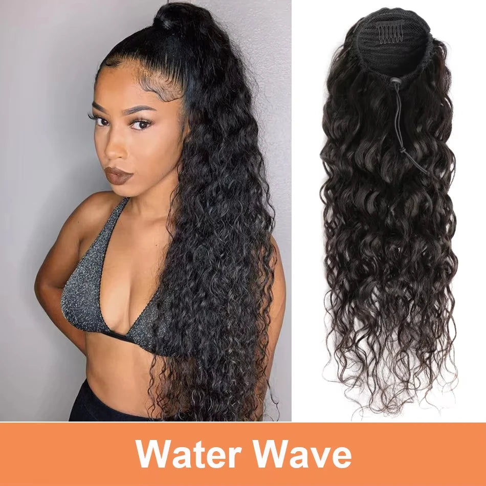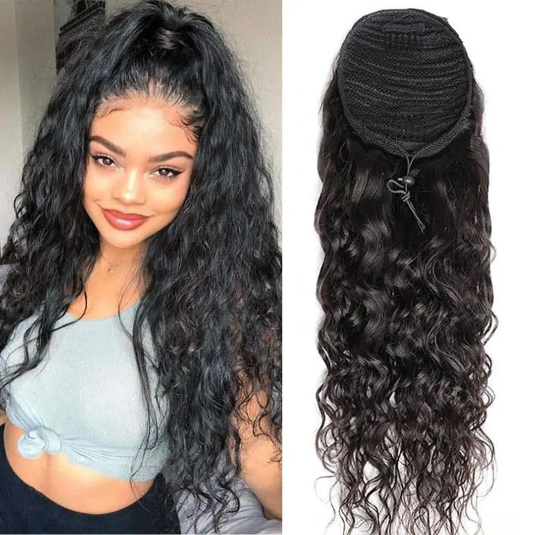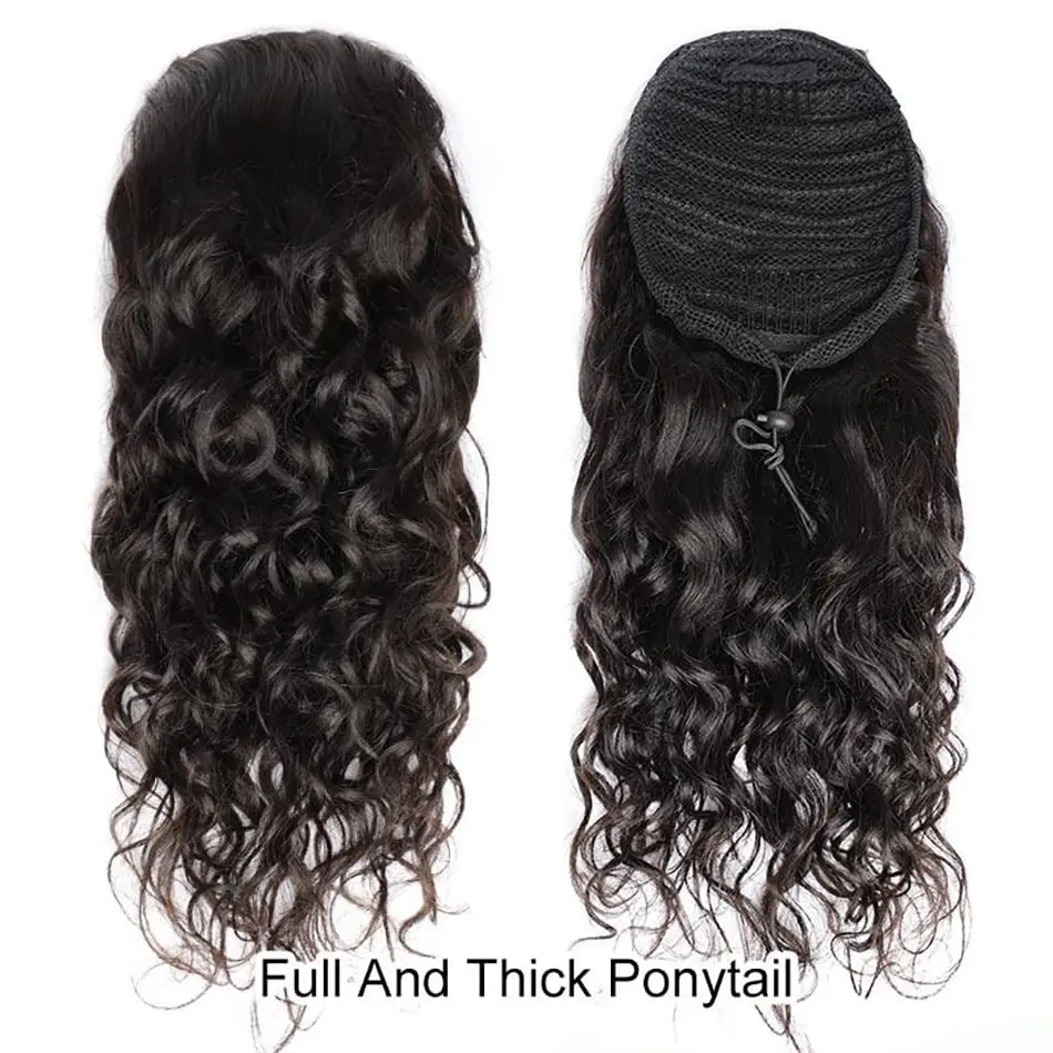 100% cabelo humano cordão rabo de cavalo extensão onda de água clipe de rabo de cavalo em extensões de rabo de cavalo